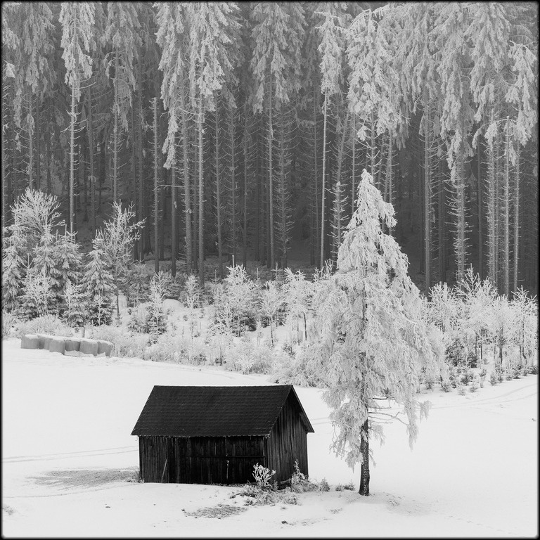 Eine dunkle Hütte im weißen Schweigen,umarmt vom Frost der stillen Zweige,